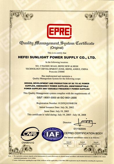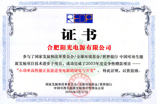 "小功率高性能正弦波逆變電源的研究與開發(fā)"項(xiàng)目資格證書