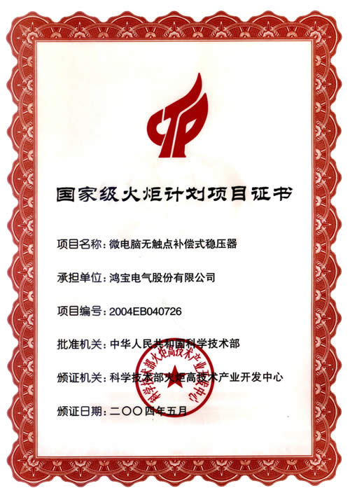 國家級火炬計劃項目證書