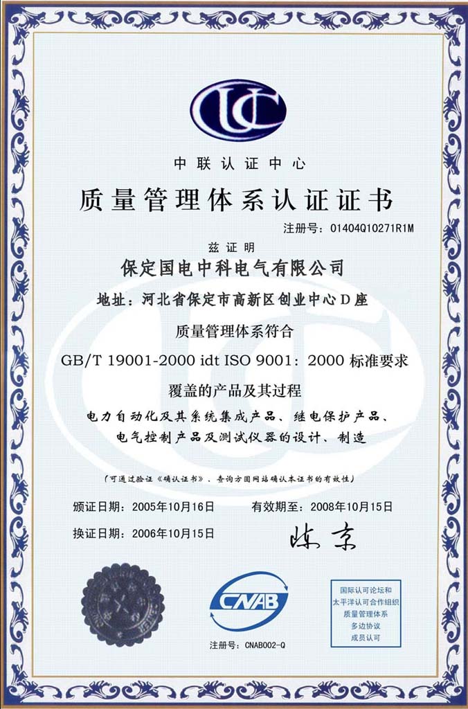 ISO9001質量體系認證證書