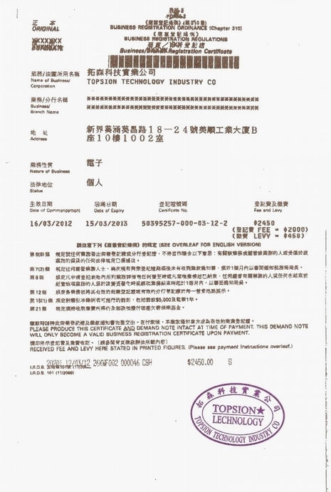拓森科技2012年香港商業(yè)登記證